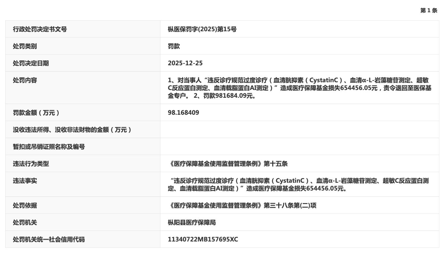 违法事实显示,当事人“违反诊疗规范过度诊疗(血清胱抑素(CystatinC)、血清α-L-岩藻糖苷测定、超敏C反应蛋白测定、血清载脂蛋白AI测定)”造成医疗保障基金损失654456.05元。