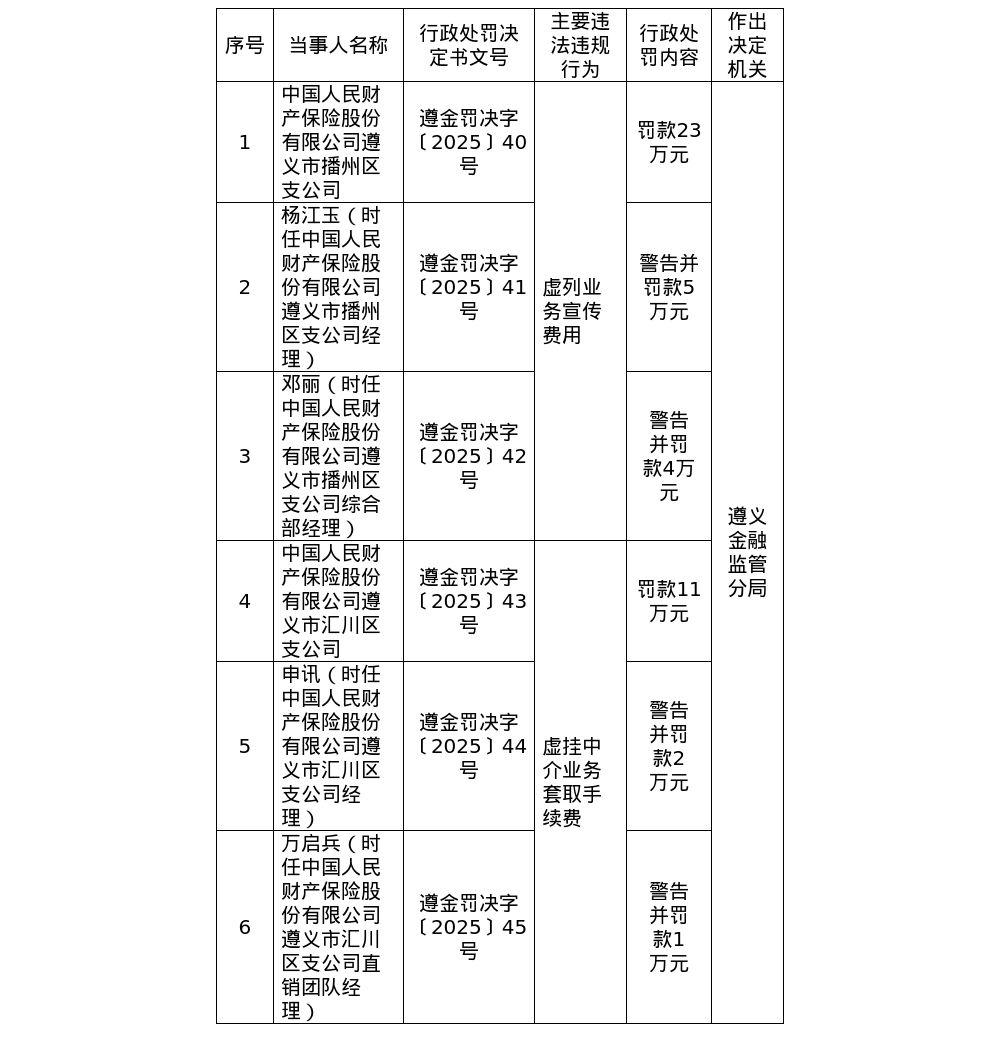 针对上述违法违规行为,国家金融监督管理总局遵义监管分局对该公司罚款23万元;对时任中国人民财产保险股份有限公司遵义市播州区支公司经理杨江玉,警告并处罚款5万元;对时任中国人民财产保险股份有限公司遵义市播州区支公司综合部经理邓丽,警告并处罚款4万元。