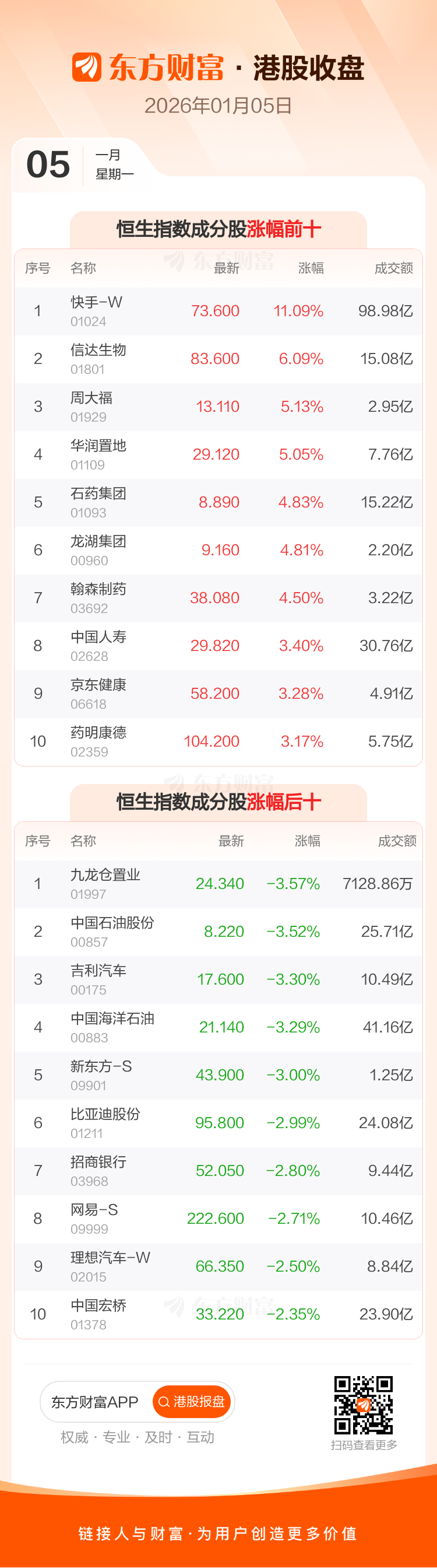 1月5日,恒生指数收报26347.24点,涨8.77点,涨幅0.03%;恒生科技指数收报5741.63点,涨5.19点,涨幅0.09%。恒生指数成分股中快手-W、信达生物、周大福涨幅居前,九龙仓置业、中国石油股份、吉利汽车跌幅靠前。恒生科技指数成分股中快手-W、哔哩哔哩-W、华虹半导体涨幅居前,蔚来-SW、小鹏汽车-W、零跑汽车跌幅靠前。