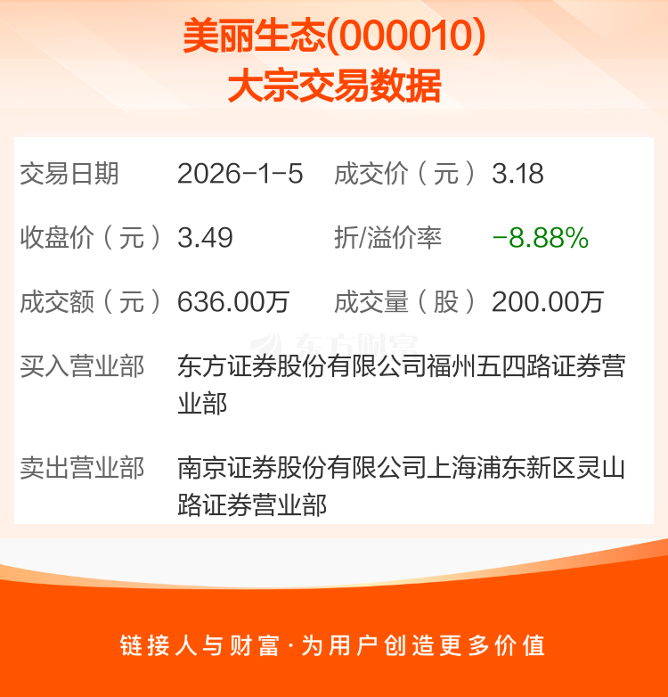 2026年1月5日,美丽生态发生1笔大宗交易,共成交200.00万股,成交金额636.00万元,占其流通市值比例为0.21%。