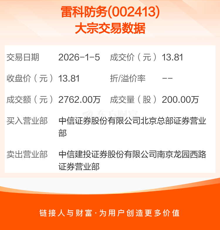 2026年1月5日,雷科防务发生1笔大宗交易,共成交200.00万股,成交金额2762.00万元,占其流通市值比例为0.15%。