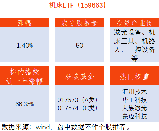 机床ETF(159663),紧密跟踪的中证机床指数,涵盖了我国制造业产业链中的关键一环——高端装备制造领域,涉及激光设备、机床工具、机器人、工控设备等行业,是新质生产力理念强调创新驱动与产业升级落地实践的核心阵地。