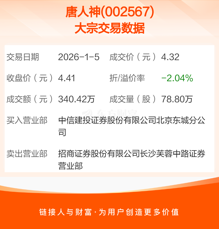 2026年1月5日,唐人神发生1笔大宗交易,共成交78.80万股,成交金额340.42万元,占其流通市值比例为0.05%。