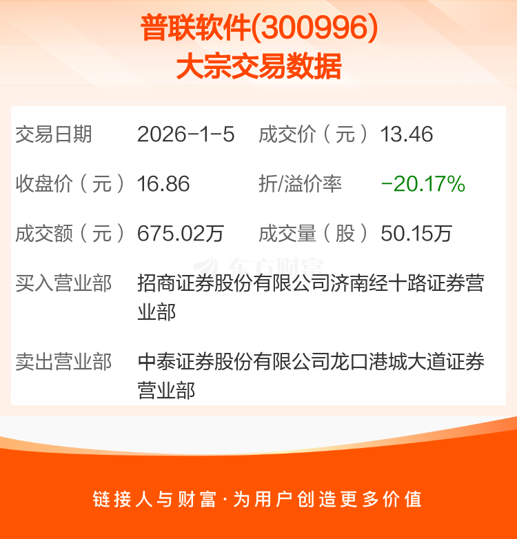 2026年1月5日,普联软件发生1笔大宗交易,共成交50.15万股,成交金额675.02万元,占其流通市值比例为0.17%。