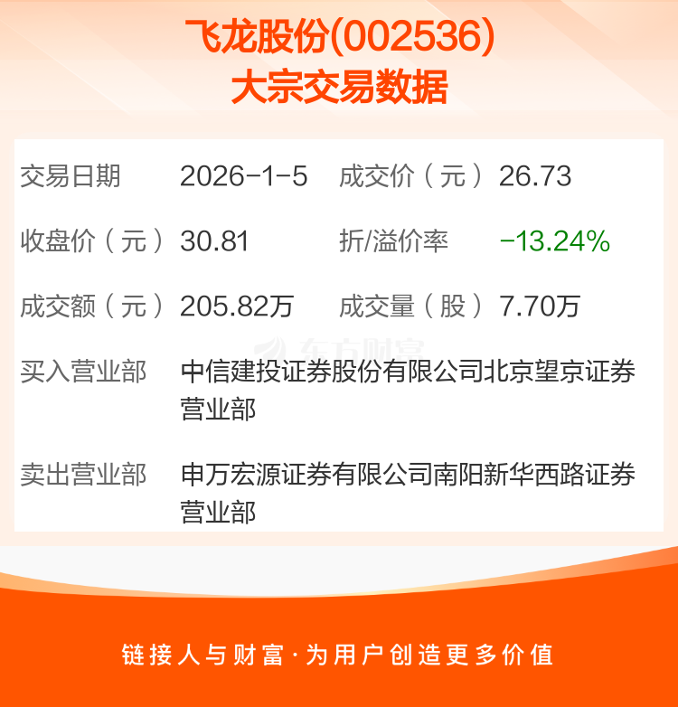 大宗交易:飞龙股份成交205.82万元,折价13.24%(1-5)