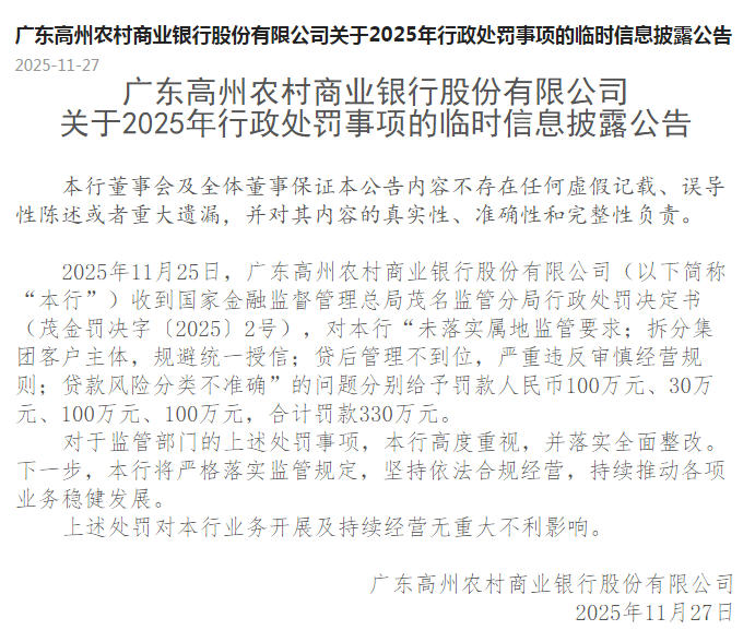 在2025年11月27日,广东高州农村商业银行已对该行政处罚事项进行披露。