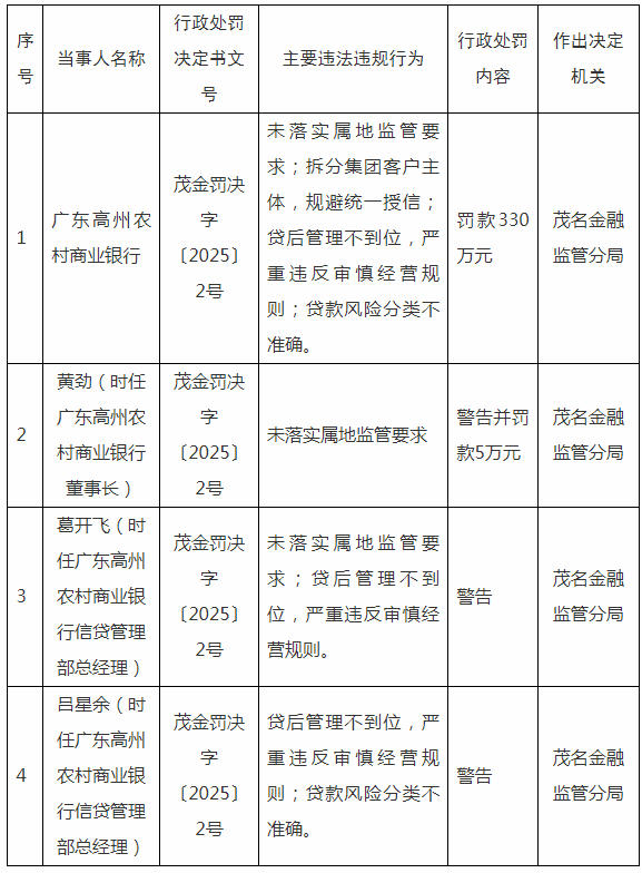 广东高州农商行被罚330万,从董事长到信贷总经理全追责:规避统一授信、贷后失职等