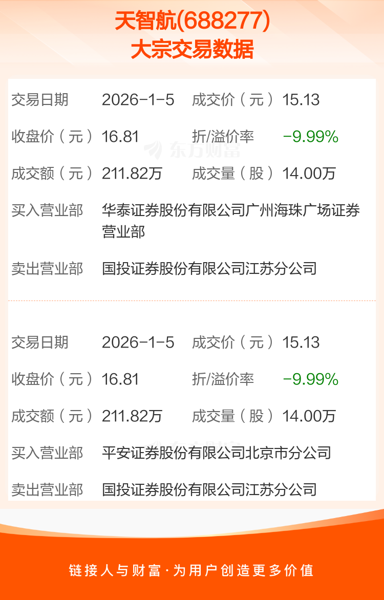 2026年1月5日,天智航发生2笔大宗交易,共成交28.00万股,成交金额423.64万元,占其流通市值比例为0.06%。