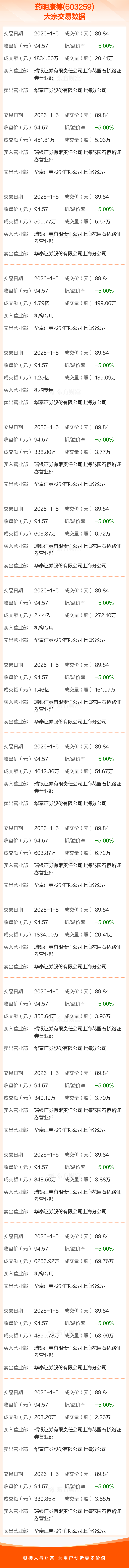 2026年1月5日,药明康德发生19笔大宗交易,共成交1033.84万股,成交金额9.29亿元,占其流通市值比例为0.40%。