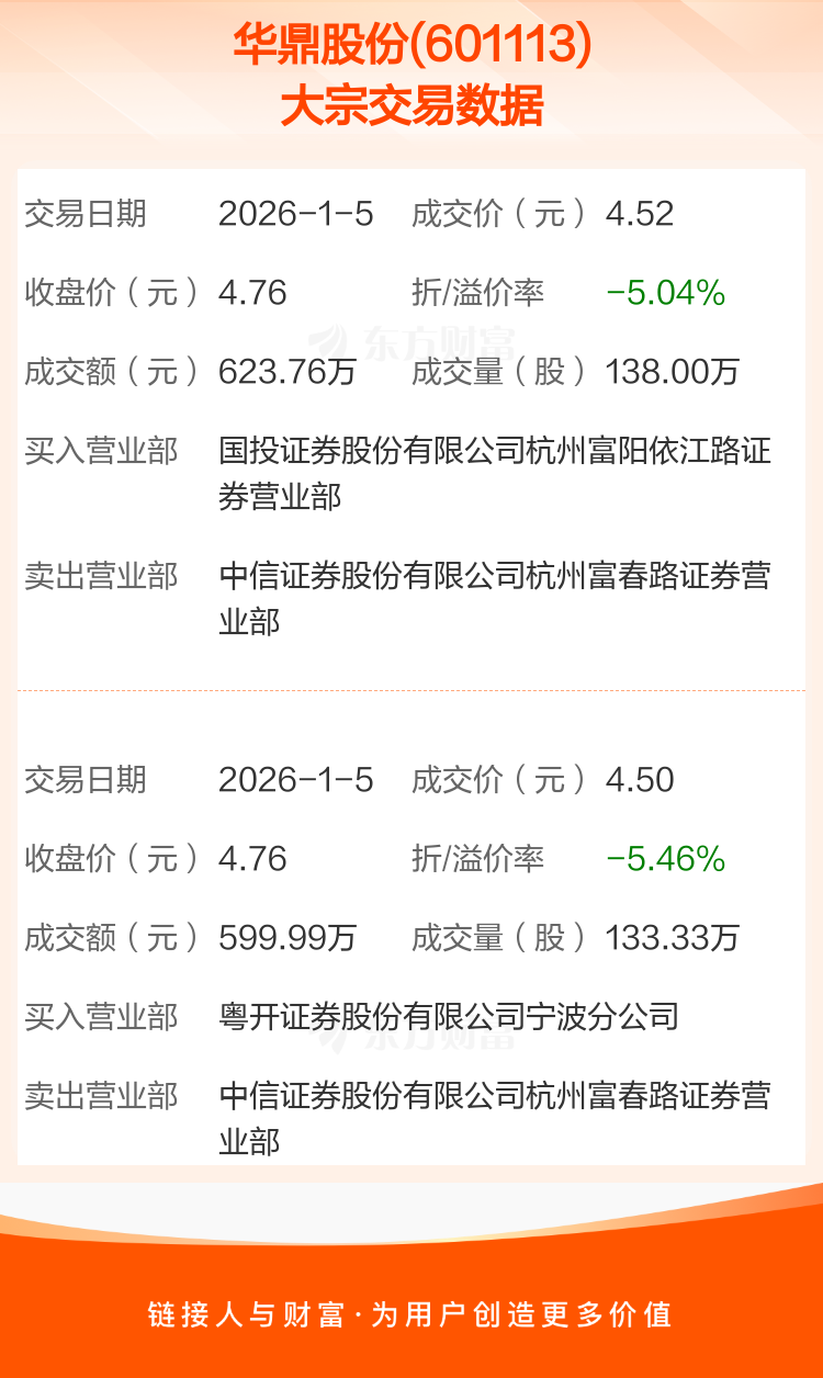 2026年1月5日,华鼎股份发生2笔大宗交易,共成交271.33万股,成交金额1223.75万元,占其流通市值比例为0.23%。