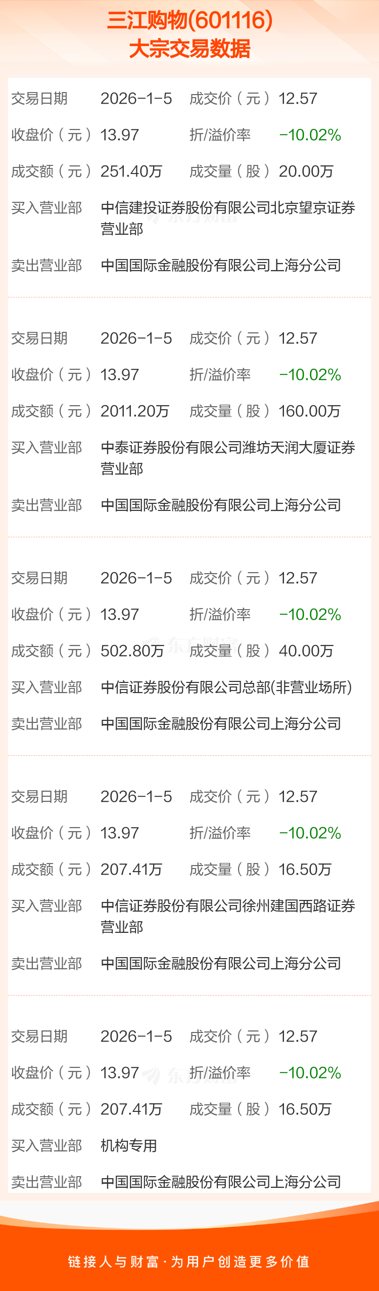 2026年1月5日,三江购物发生5笔大宗交易,共成交253.00万股,成交金额3180.22万元,占其流通市值比例为0.42%。