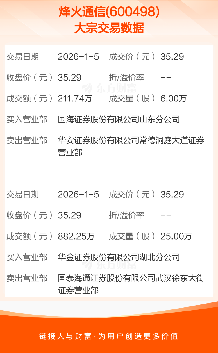 2026年1月5日,烽火通信发生2笔大宗交易,共成交31.00万股,成交金额1093.99万元,占其流通市值比例为0.02%。