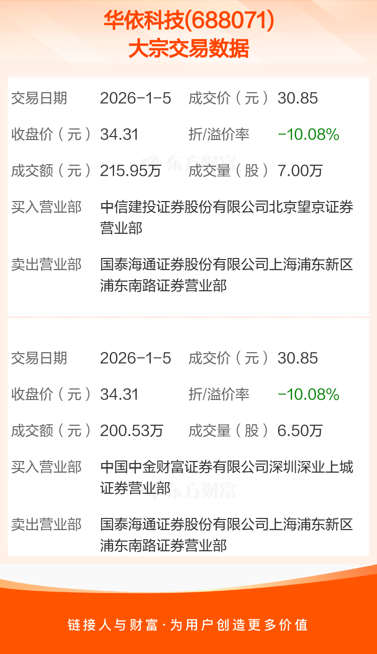 2026年1月5日,华依科技发生2笔大宗交易,共成交13.50万股,成交金额416.48万元,占其流通市值比例为0.14%。