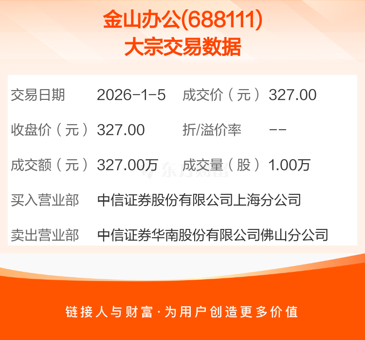 2026年1月5日,金山办公发生1笔大宗交易,共成交1.00万股,成交金额327.00万元。