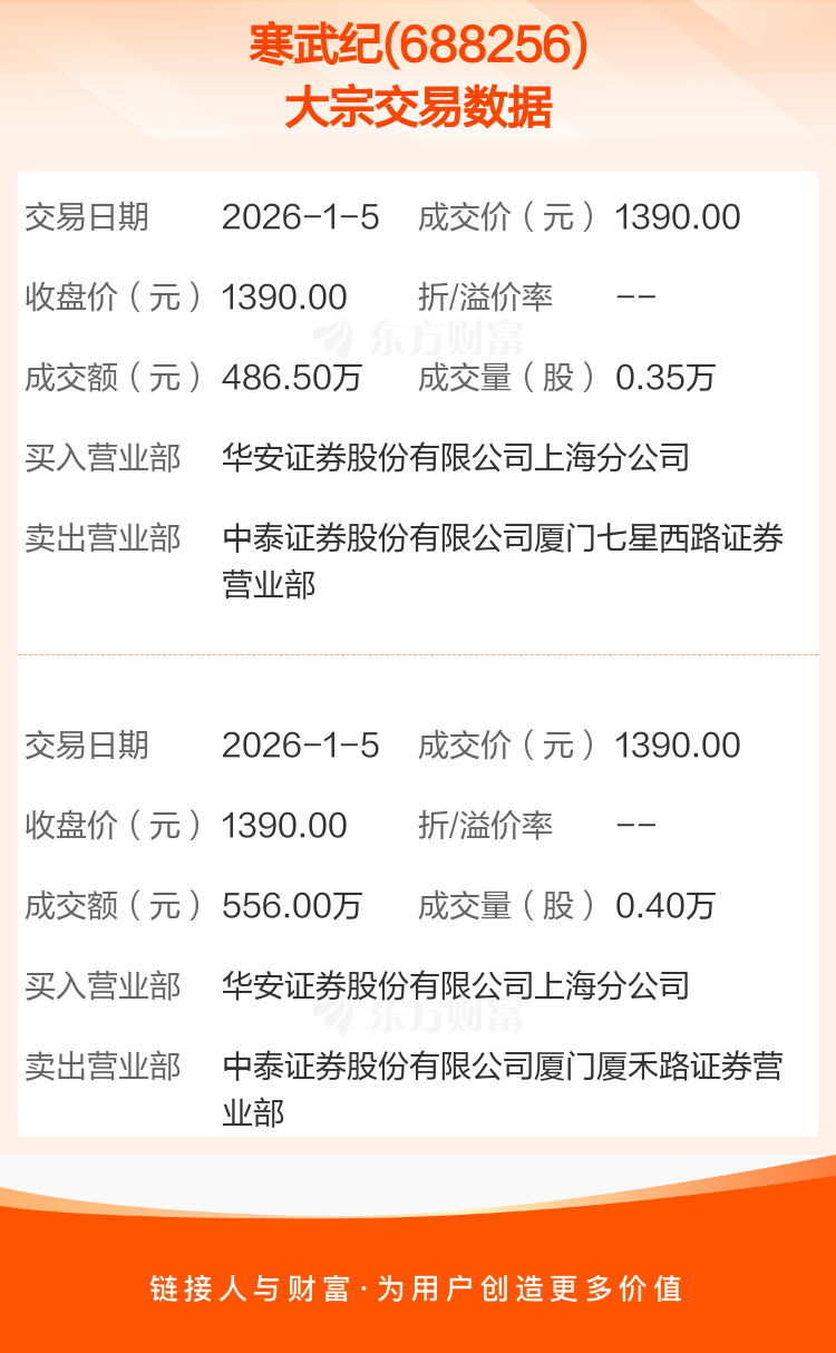 2026年1月5日,寒武纪发生2笔大宗交易,共成交7500股,成交金额1042.50万元。