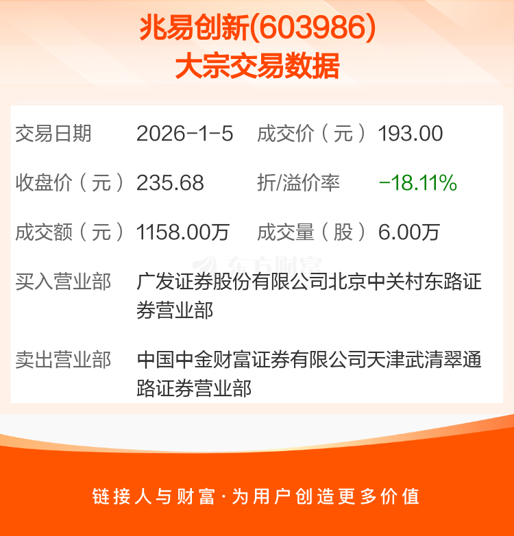 2026年1月5日,兆易创新发生1笔大宗交易,共成交6.00万股,成交金额1158.00万元。