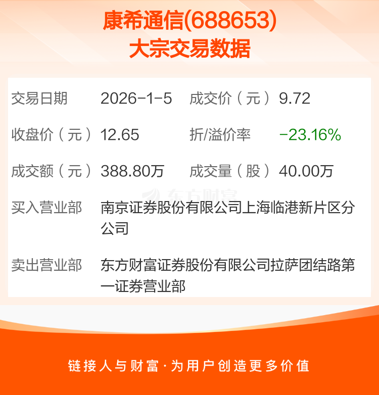 2026年1月5日,康希通信发生1笔大宗交易,共成交40.00万股,成交金额388.80万元,占其流通市值比例为0.10%。