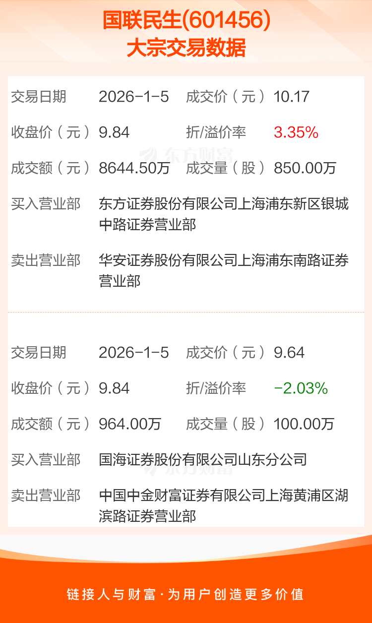 大宗交易:国联民生成交9608.50万元,溢价2.79%(1-5)