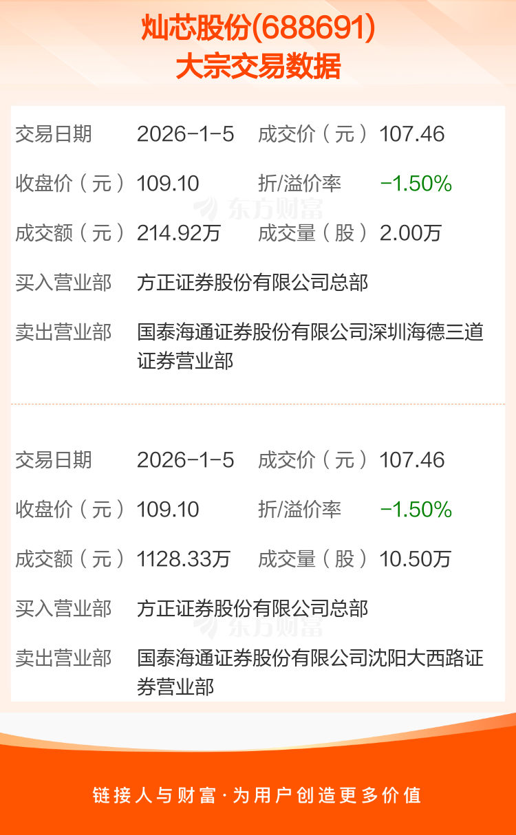 2026年1月5日,灿芯股份发生2笔大宗交易,共成交12.50万股,成交金额1343.25万元,占其流通市值比例为0.17%。