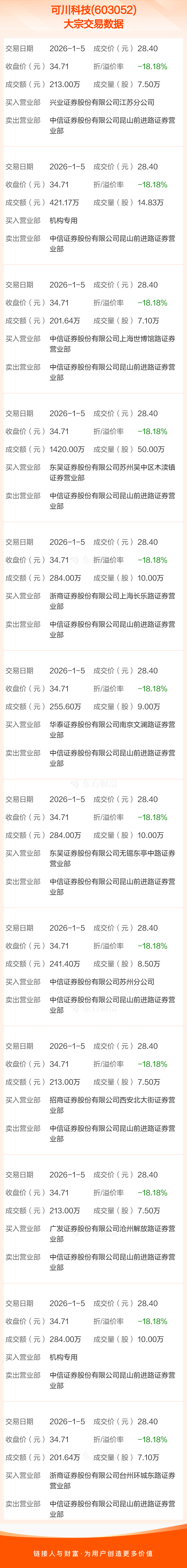 2026年1月5日,可川科技发生12笔大宗交易,共成交149.03万股,成交金额4232.45万元,占其流通市值比例为0.65%。