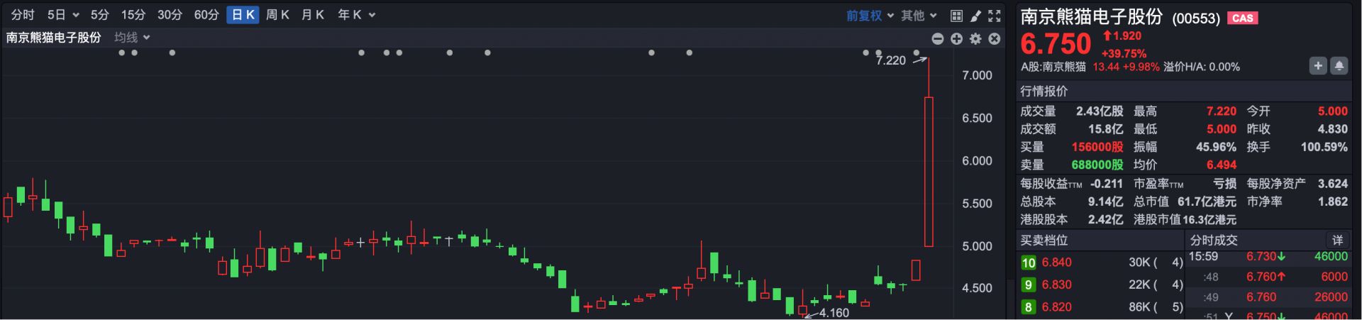 再看今日盘面焦点,脑机接口概念大涨,南京熊猫电子股份(HK00553)涨超39%,微创脑科学(HK02172)涨超19%,脑洞极光-B(HK06681)涨超15%。