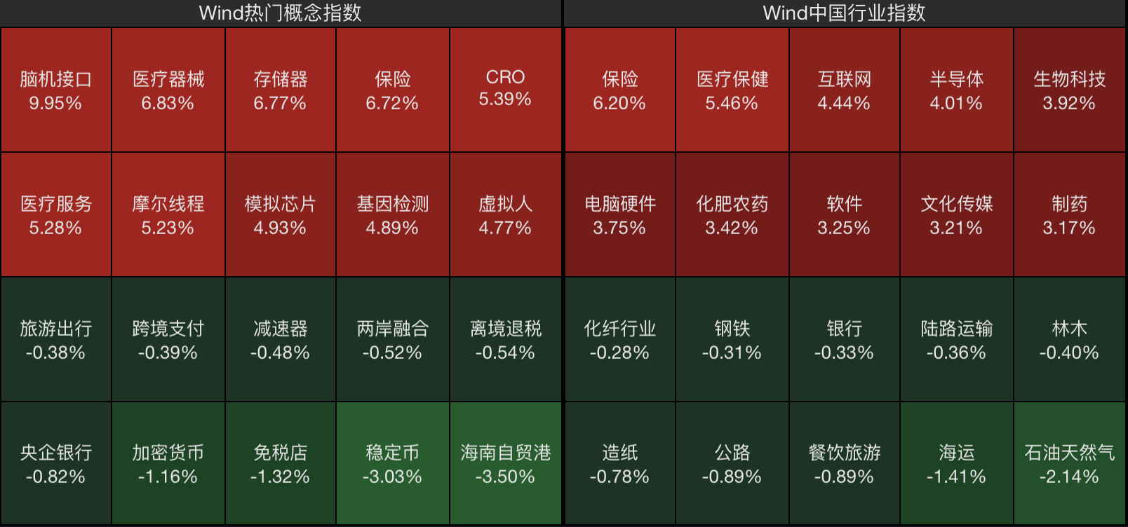 全天来看,脑机接口、保险、医疗器械、存储器、CRO等板块持续活跃。但海南自贸港板块调整幅度较大,稳定币、加密货币、免税店板块跌幅靠前。