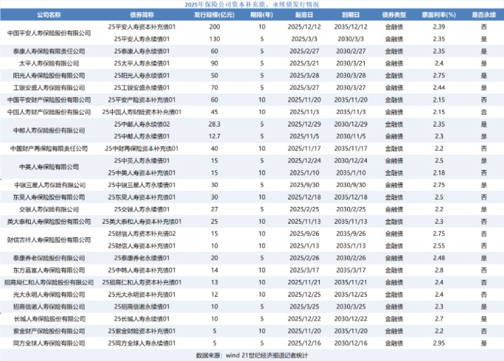据21世纪经济报道记者不完全统计,最近三年,保险公司发行资本补充债和永续债规模均超千亿,2023年为1121.7亿元、2024年为1175亿元。Wind数据显示,2025年有23家保险公司发行资本补充债、永续债合计27只,发行规模为1042亿元。其中,永续债发行规模为558亿元、资本补充债发行规模为484亿元。