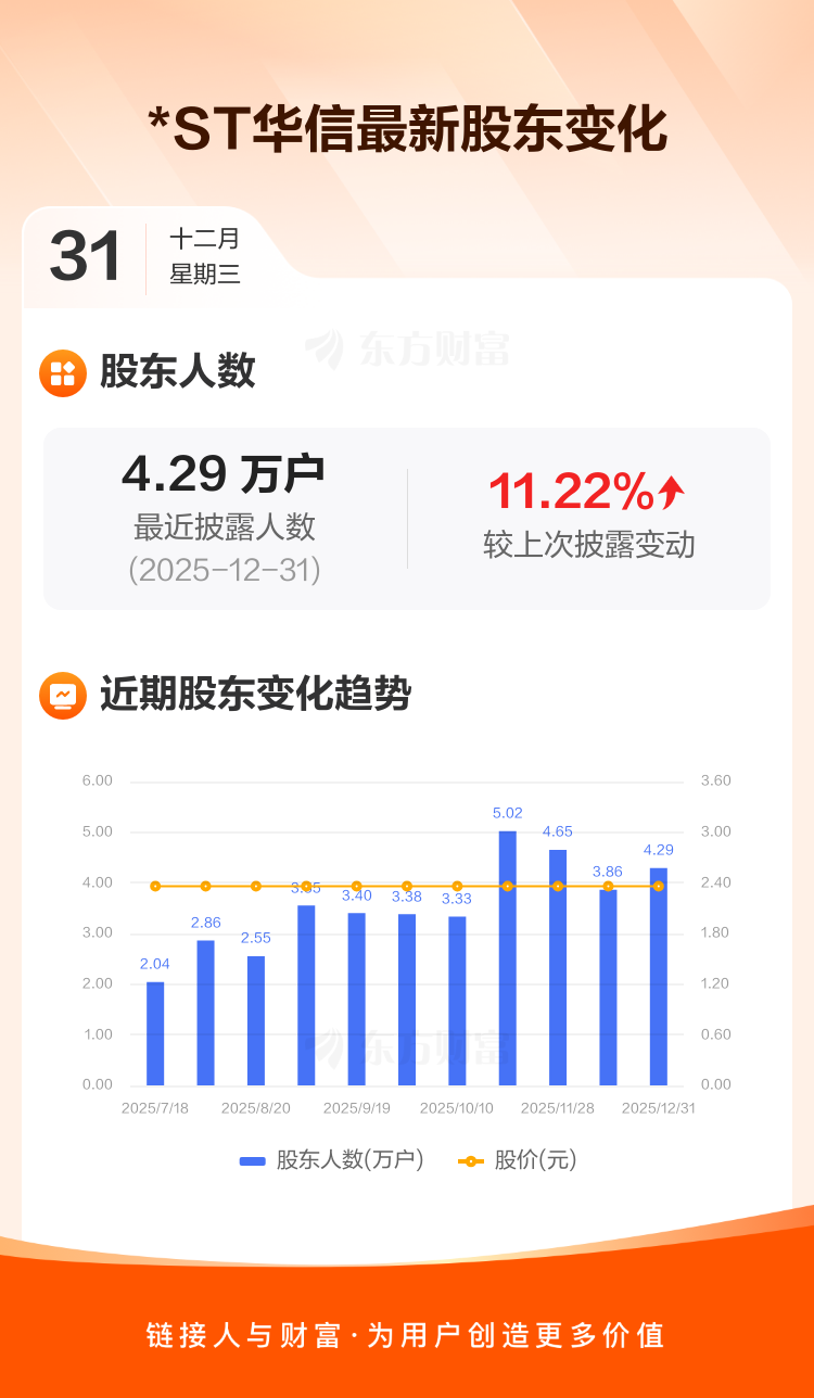 *ST华信:截至12月31日最新股东户数4.29万户,较上期增加11.22%