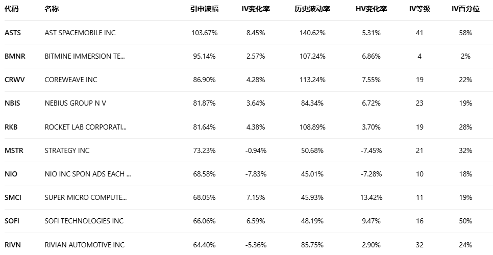 美股期权波动率排行榜前十(标的市值>100亿美元,且期权成交量>10万张)
