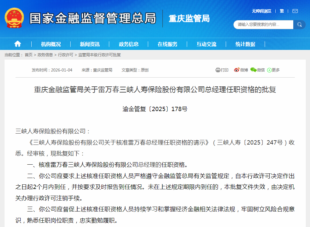 1月4日,重庆金融监管局发布批复,核准雷万春三峡人寿保险股份有限公司(下称“三峡人寿”)总经理的任职资格。