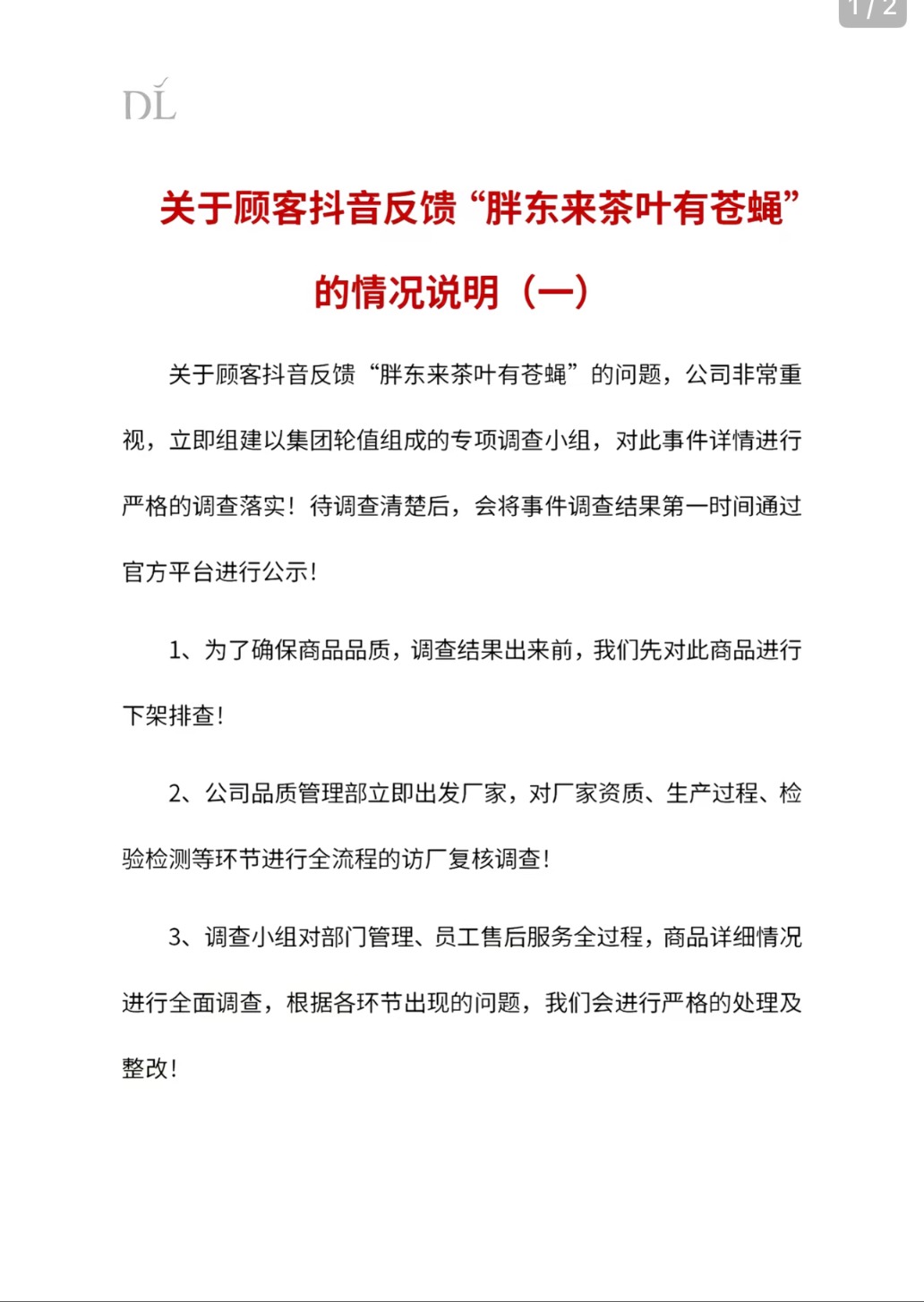中新网1月5日电(吴家驹)此前,有顾客在抖音平台反馈“胖东来茶叶有苍蝇”。1月5日,胖东来发布情况说明称,公司非常重视,立即组建以集团轮值组成的专项调查小组,对此事件详情进行严格的调查落实。待调查清楚后,会将事件调查结果第一时间通过官方平台进行公示。