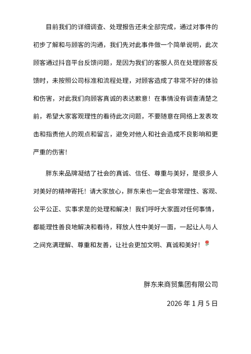 此外,胖东来称,目前详细调查、处理报告还未全部完成,通过对事件的初步了解和与顾客的沟通,先对此事件做一个简单说明。此次顾客通过抖音平台反馈问题,是因为胖东来客服人员在处理顾客反馈时,未按照公司标准和流程处理,对顾客造成了非常不好的体验和伤害,对此向顾客真诚的表达歉意。(完)