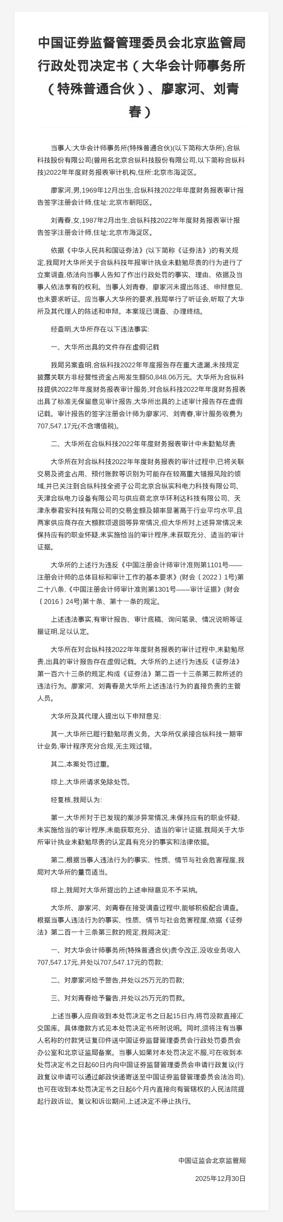 决定书显示,大华所在对合纵科技2022年年度财务报表的审计过程中,未勤勉尽责,出具的审计报告存在虚假记载。