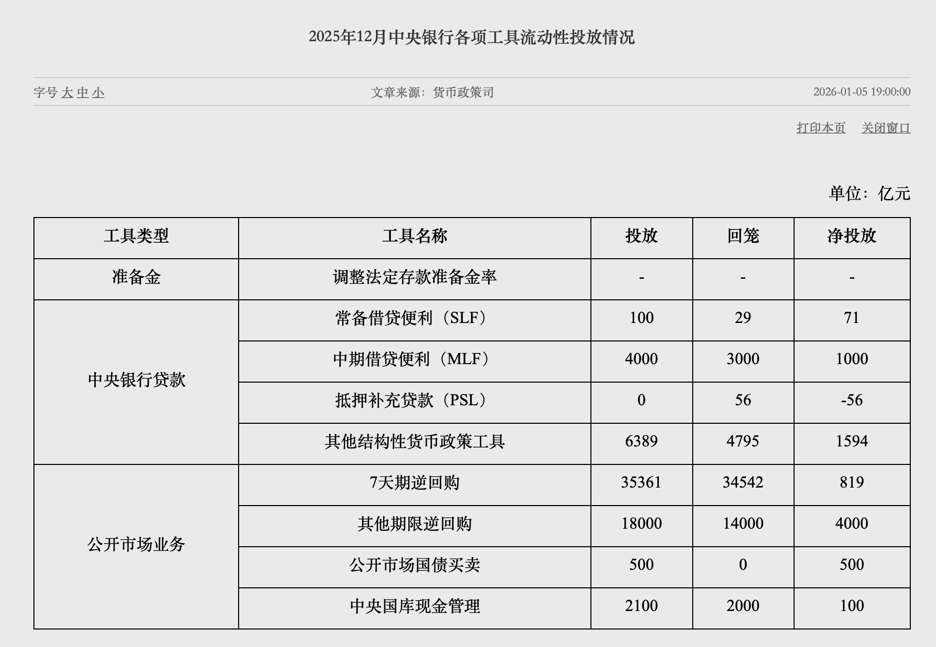 1月5日,央行公布2025年12月各项工具流动性投放情况,中央银行贷款方面,常备借贷便利(SLF),净投放71亿元;中期借贷便利(MLF)净投放1000亿元,抵押补充贷款(PSL)净回笼56亿元;公开市场业务方面,7天期逆回购净投放819亿元,公开国债买卖净投放500亿元,为连续第三个月开展国债买卖操作;中央国库现金管理净投放100亿元。