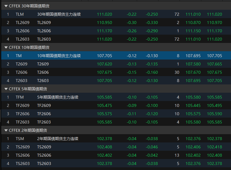 上证报中国证券网讯 1月6日,国债期货午盘全线下跌,30年期主力合约跌0.22%,报111.020元;10年期主力合约跌0.12%,报107.705元;5年期主力合约跌0.10%,报105.585元;2年期主力合约跌0.04%,报102.378元。