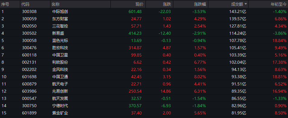 沪深两市半日成交额1.78万亿,较上个交易日放量1455亿。个股方面,中际旭创半日成交额超143亿元居首,东方财富、三花智控、新易盛、蓝色光标等成交额均在100亿元以上。