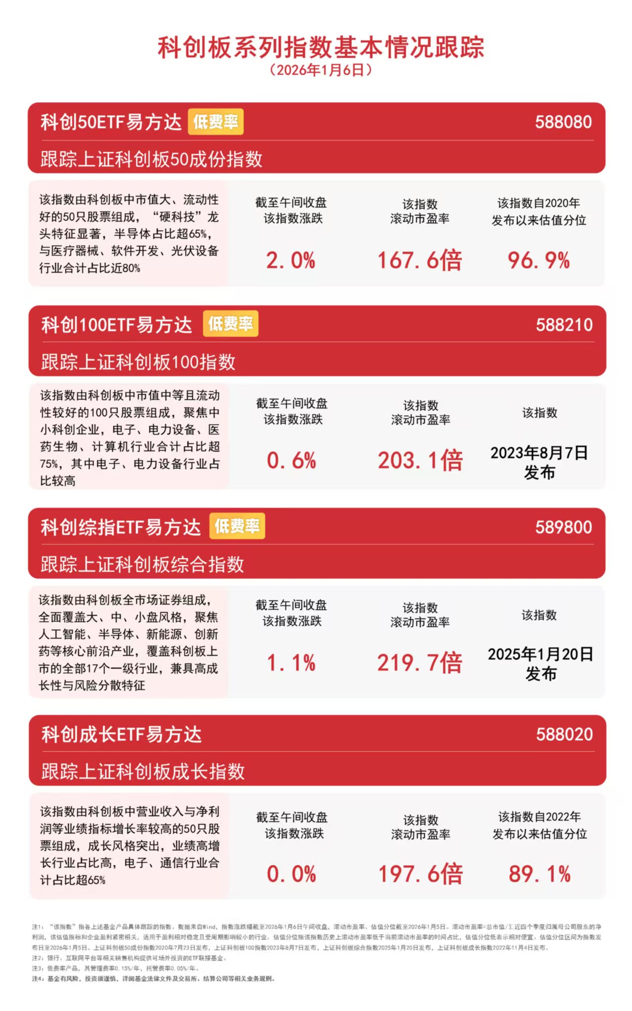 今日早盘,半导体设备、集成电路等板块走强,科创板局部活跃。截至午间收盘,科创50指数上涨2.0%,科创综指上涨1.1%,科创100指数上涨0.6%,科创成长指数上涨0.01%,科创50ETF易方达(588080)半日成交额超13亿元,较昨日有所放量。