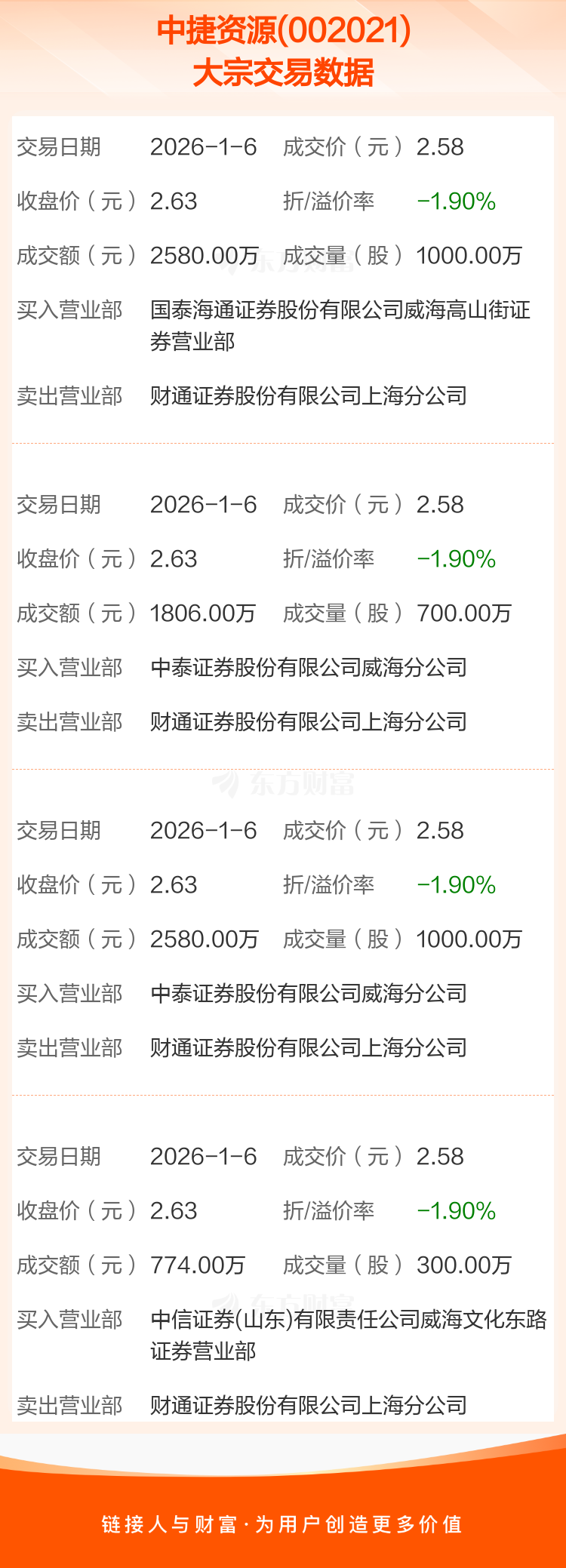 2026年1月6日,中捷资源发生4笔大宗交易,共成交3000.00万股,成交金额7740.00万元,占其流通市值比例为2.46%。