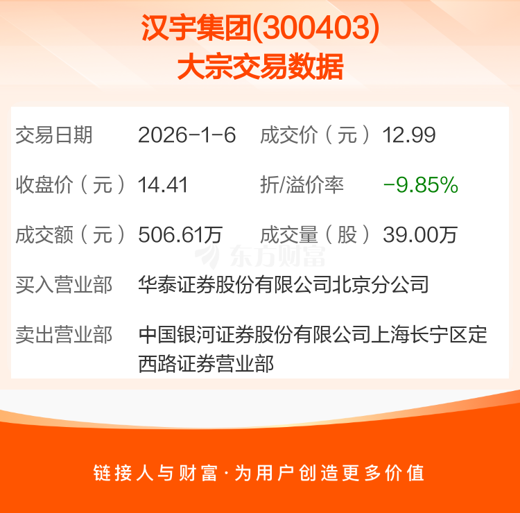 大宗交易:汉宇集团成交506.61万元,折价9.85%(1-6)