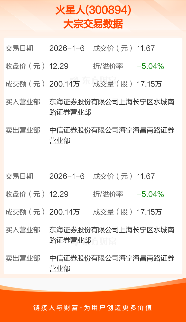 2026年1月6日,火星人发生2笔大宗交易,共成交34.30万股,成交金额400.28万元,占其流通市值比例为0.11%。