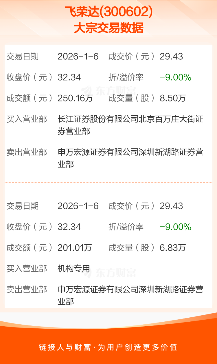 2026年1月6日,飞荣达发生2笔大宗交易,共成交15.33万股,成交金额451.17万元,占其流通市值比例为0.04%。