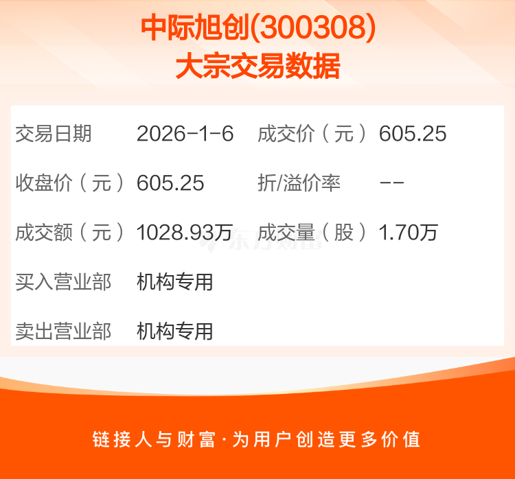 2026年1月6日,中际旭创发生1笔大宗交易,共成交1.70万股,成交金额1028.93万元。