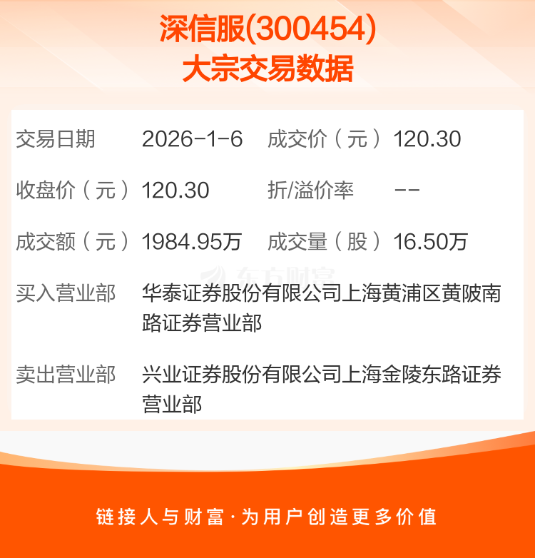 2026年1月6日,深信服发生1笔大宗交易,共成交16.50万股,成交金额1984.95万元,占其流通市值比例为0.06%。