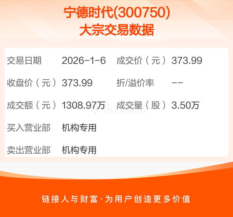 2026年1月6日,宁德时代发生1笔大宗交易,共成交3.50万股,成交金额1308.97万元。