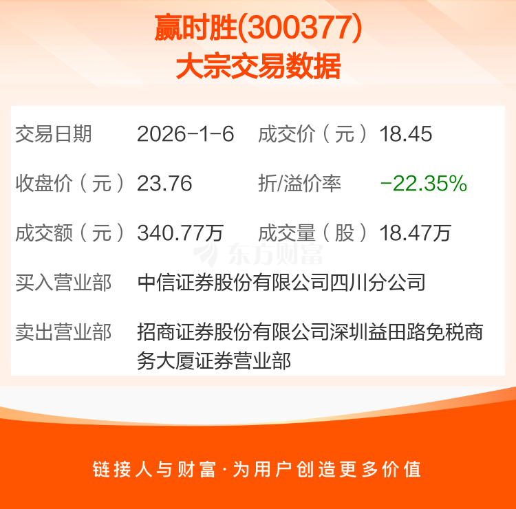 2026年1月6日,赢时胜发生1笔大宗交易,共成交18.47万股,成交金额340.77万元,占其流通市值比例为0.02%。