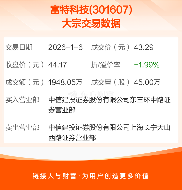 2026年1月6日,富特科技发生1笔大宗交易,共成交45.00万股,成交金额1948.05万元,占其流通市值比例为0.39%。