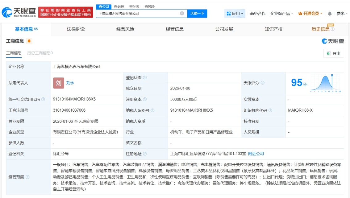 南方财经1月6日电,天眼查工商信息显示,1月6日,上海纵横无界汽车有限公司成立,法定代表人为刘永,注册资本5亿人民币,经营范围包括汽车销售、汽车零配件零售、汽车装饰用品销售、润滑油销售等。股东信息显示,该公司由奇瑞汽车股份有限公司全资持股。
