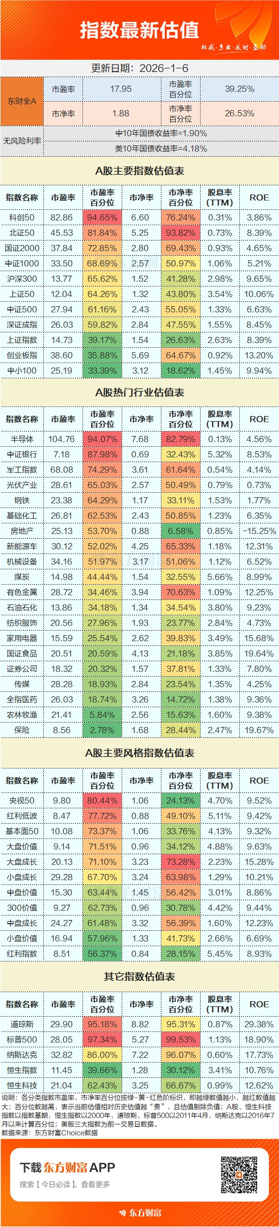 截至1月6日收盘,东方财富Choice数据显示,东财全A市盈率为17.95倍,市盈率百分位为39.25%;市净率为1.88倍,市净率百分位为26.53%。