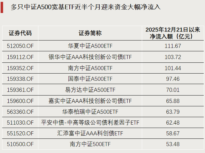 最新监测数据显示,自2025年12月21日至2026年1月5日的半个月内,中证A500宽基ETF迎来资金大幅净流入,多只ETF产品吸金规模超100亿元。