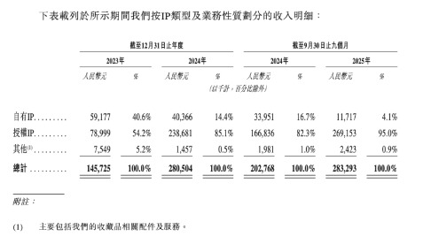 而在授权IP方面,公司已与22名IP授权方达成授权安排,包括与空山基(Hajime Sorayama)、中国冰雪运动国家队的独家授权合作,以及与全球头部IP持有方的非独家授权合作。于2023年、2024年及截至2025年9月30日止九个月,公司前五大授权IP贡献的总收入分别约占公司同期总收入的47.8%、61.5%及77.7%,而公司最大授权IP贡献的收入分别约占公司同期总收入的28.4%、17.8%及32.3%。